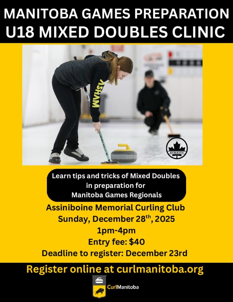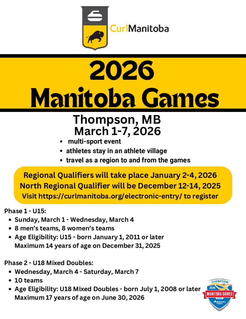 CurlManitoba will offer training camps for any athletes interested in Mixed Doubles. Athletes throughout Manitoba will participate in a Regional Qualifier in January 2026 with the winner advancing to the Manitoba Games in March 2026.